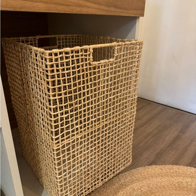 Com seu design elegante e artesanal, ela é ideal para guardar desde mantas e almofadas até revistas e objetos decorativos. V