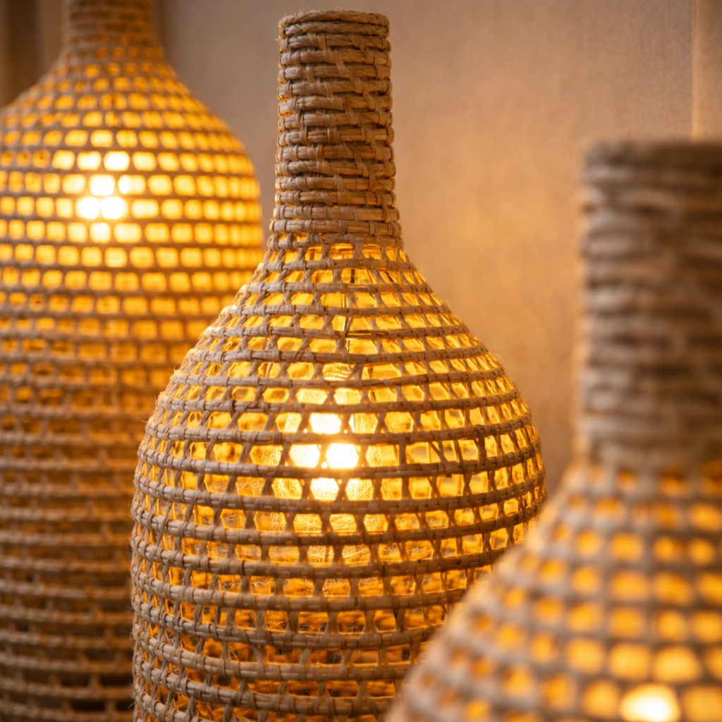 Feitas à mão com palha de carnaúba, elas são perfeitas para criar uma atmosfera relaxante e convidativa.”
