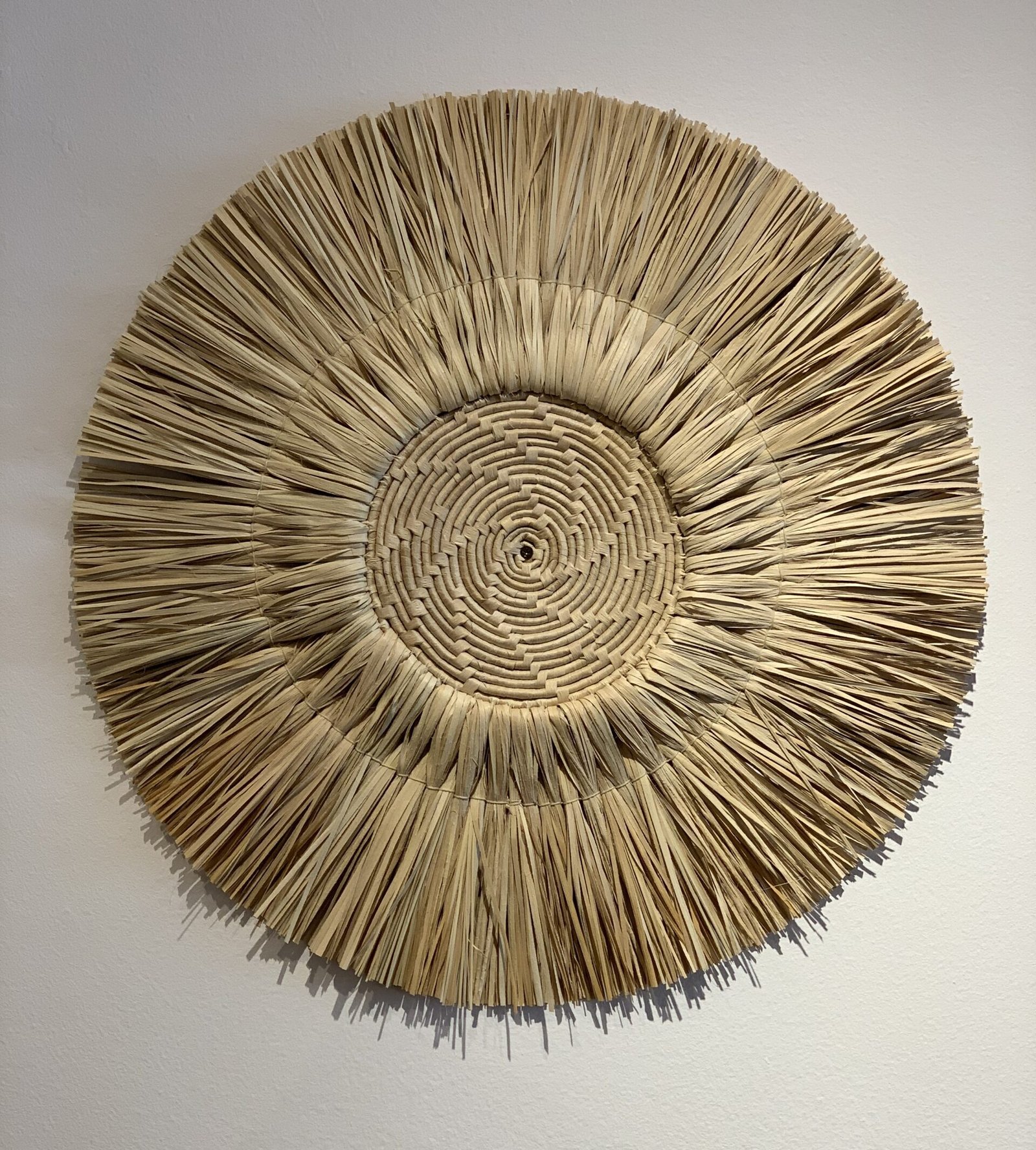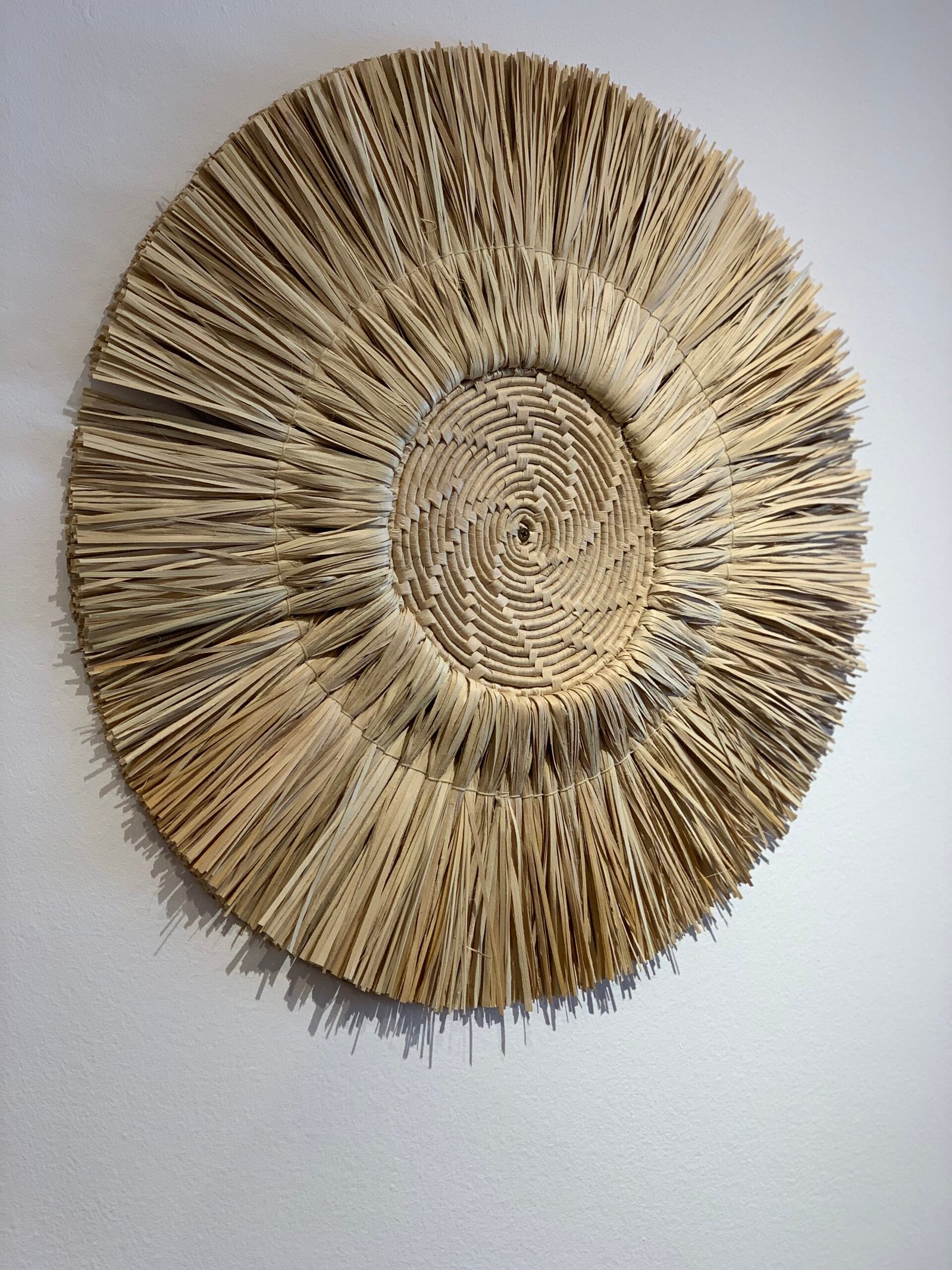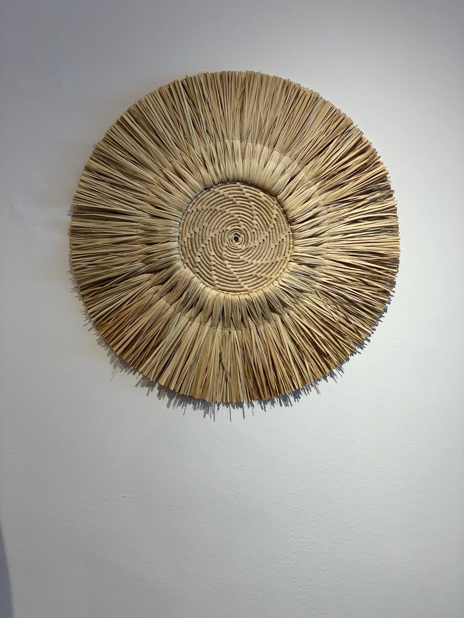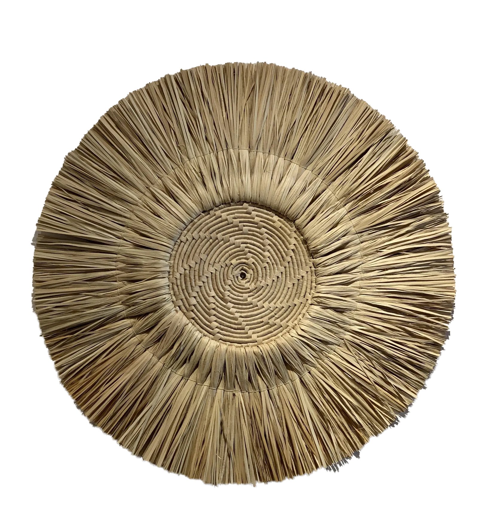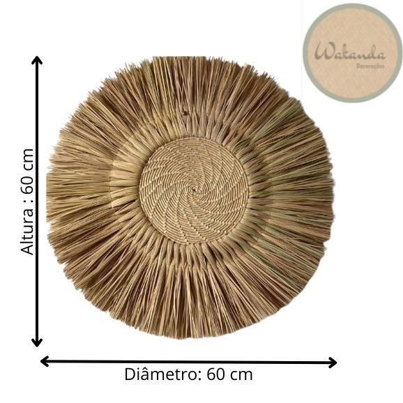 Com 60cm de diâmetro, este mandala artesanal, feita com palha de carnaúba, é mais do que um objeto decorativo: é um portal para a introspecção e a positividade.