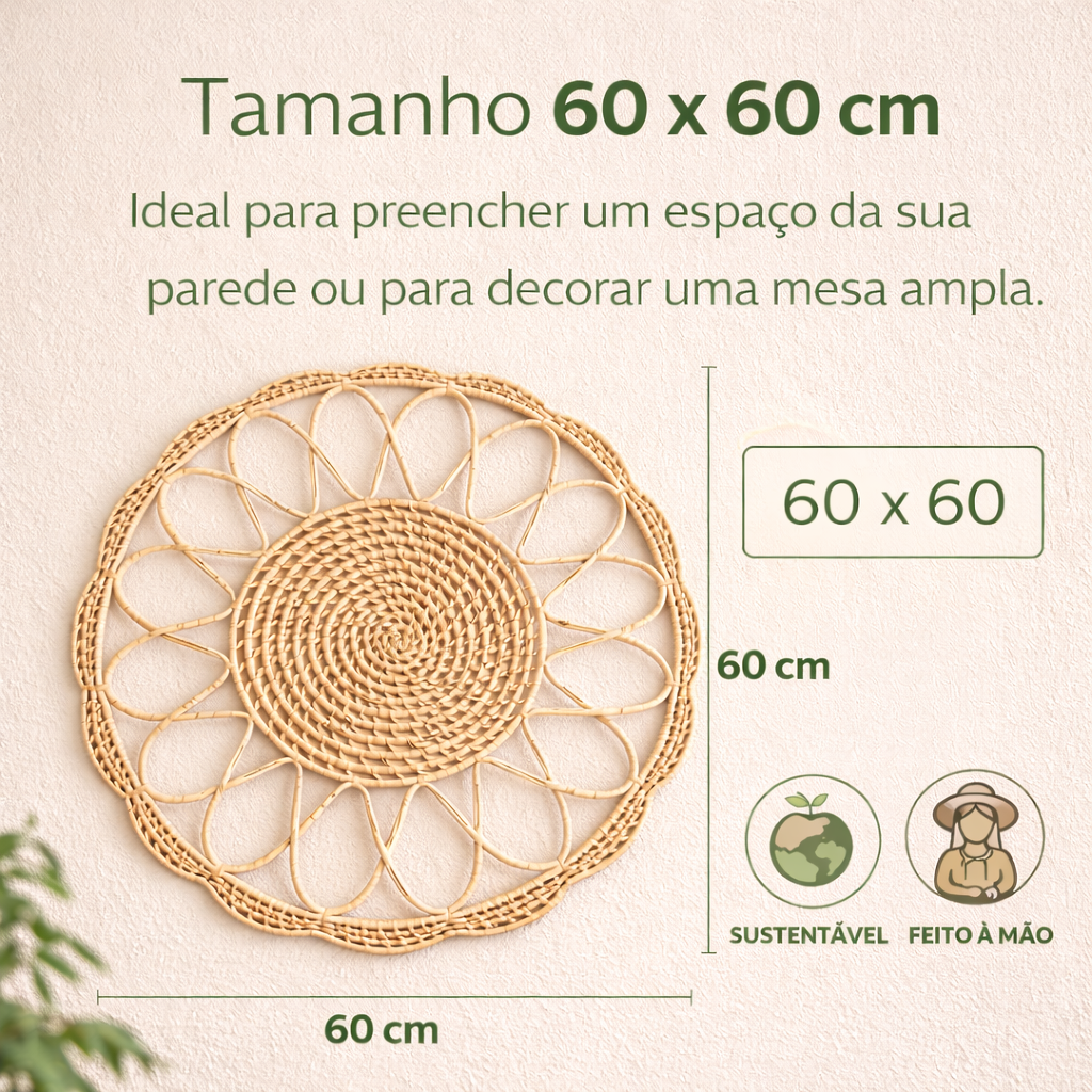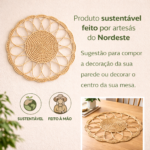 Tapete Mandala de parede em palha natural 60 cm, feito à mão por artesãs do Nordeste. Peça sustentável, leve e cheia de textura, perfeita para decorar paredes ou compor o centro da mesa com um toque natural e acolhedor.